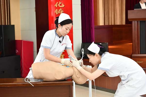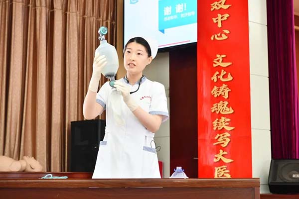 本溪市中心醫(yī)院護士王旭男、周巍現(xiàn)場進行了急診急救護理技術操作演示。